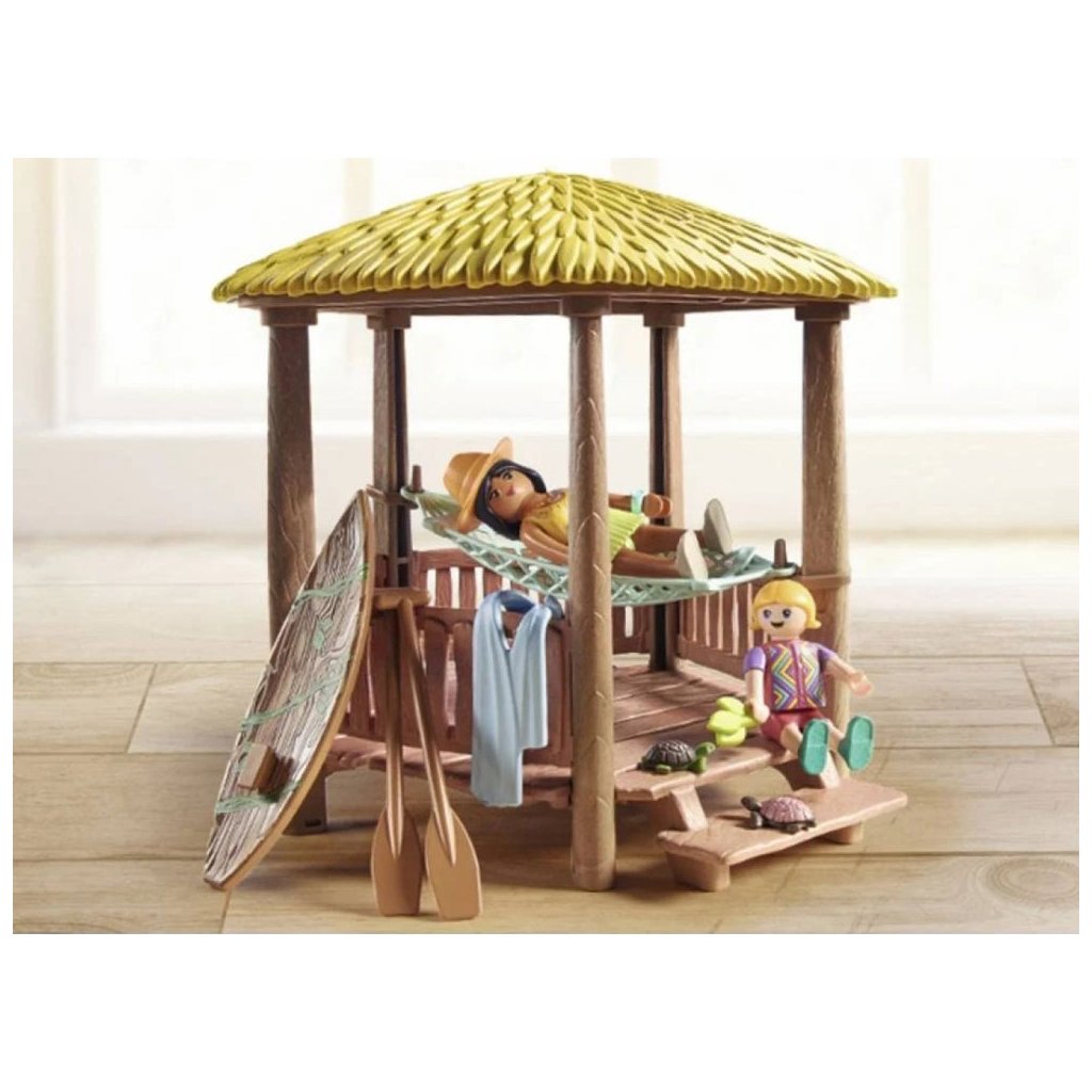 Hrací sada obsahuje dvě figurky PLAYMOBIL, říčního delfína s miminkem, želvu s miminky, dvě prkna s pádly, plážovou chatku s houpací sítí a další doplňky. Webová aplikace Wiltopia nabízí více informací o světě zvířat. Jednoduše naskenujte QR kód na kartě a objevujte.