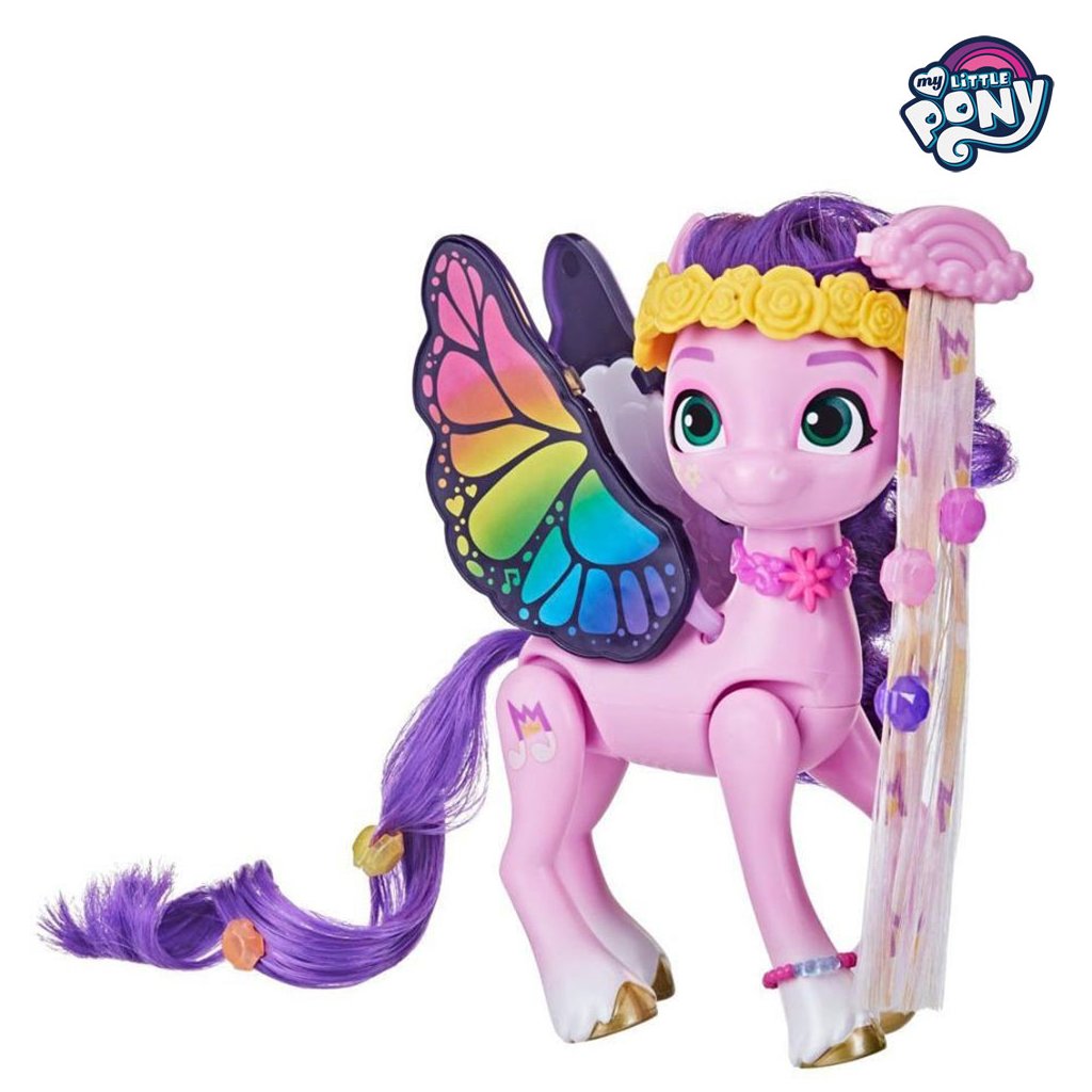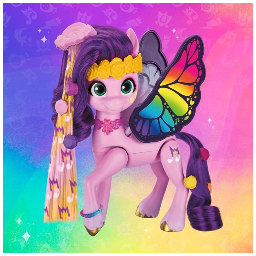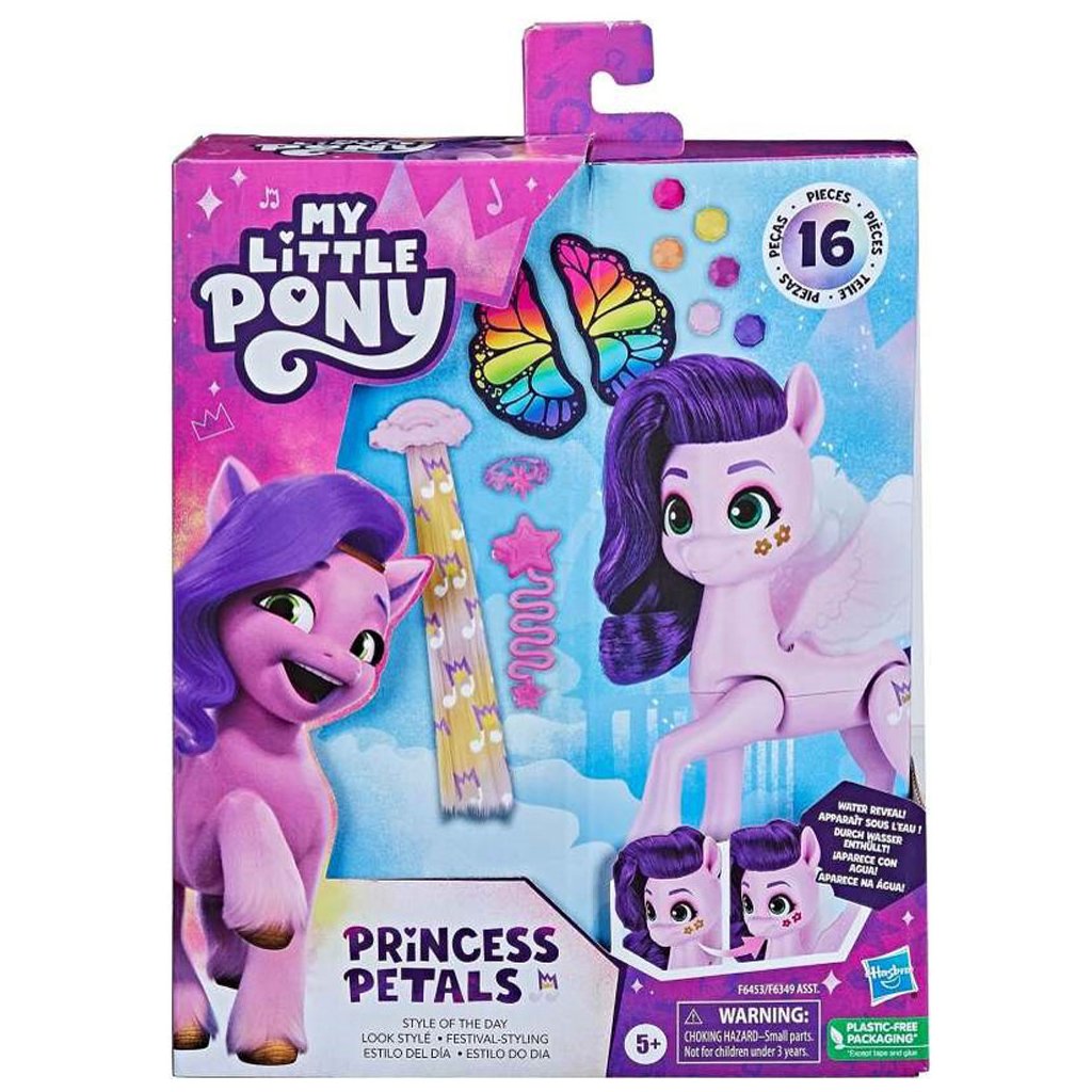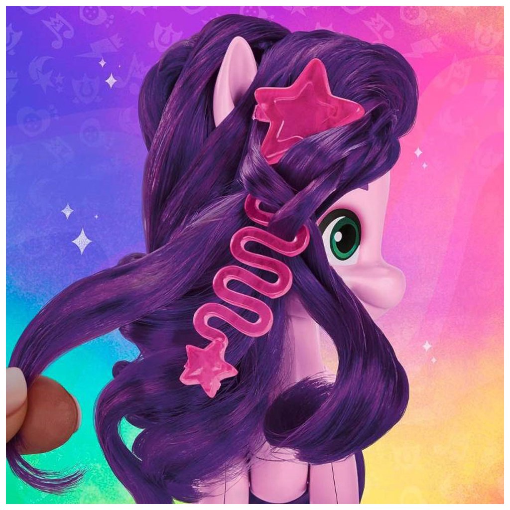Přizpůsobte si rockové účesy, úžasné outfity a zábavné doplňky s My Little Pony Style! Děti mohou poníkovi upravit hřívu a ocas pomocí prodloužování „vlasů“ s kořínky. Sponkami lze princezně ozdobit její outfit. Balení obsahuje spoustu doplňků.