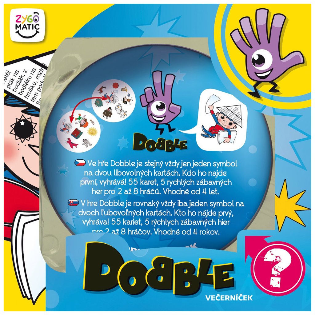 Rychlost, postřeh, reflexy! Buďte první, kdo najde shodný symbol na dvou kartách! Dobble, to je 57 různých symbolů, 55 karet, 8 symbolů na kartě a každé dvě karty spolu mají společný pouze jeden! Hra nabízí zcela unikátní zábavu.