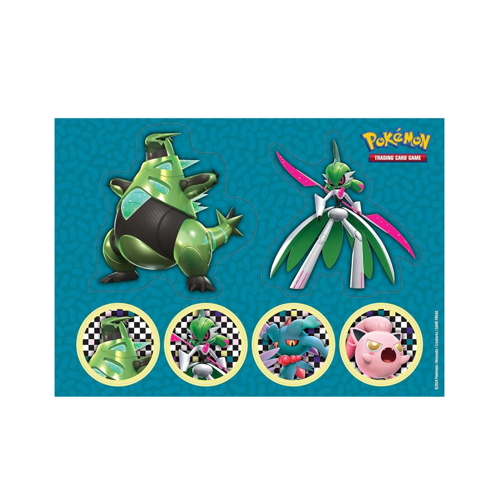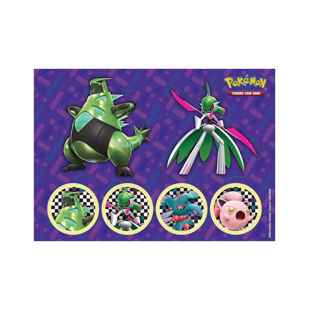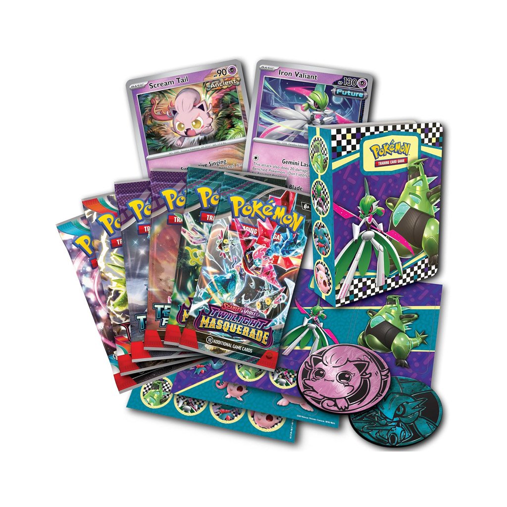 - 6 booster balíčků Pokémon TCG (2x Twilight Masquerade, 2x Temporal Forces, 1x Obsidian Flames, 1x Paradox Rift)