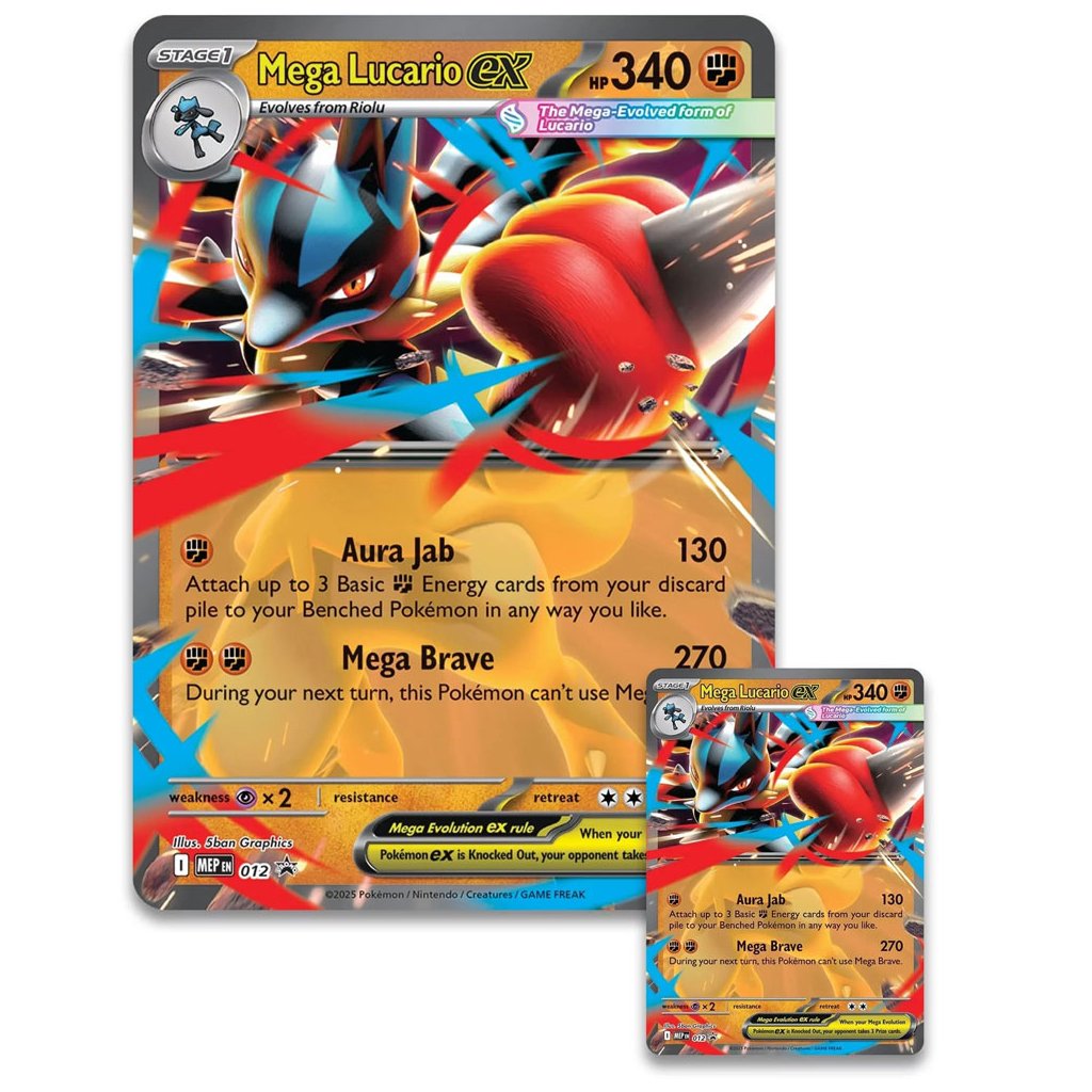 Neúprosný Mega Lucario EX drtí své soupeře a zároveň sdílí Energii se svými společníky na lavičce! Přidejte tuto obrovskou sílu do své sbírky jako hratelnou Foil promo kartu, doplněnou o oversized promo kartu a detailní figurku, která ukazuje Mega Lucaria v akci. V boxu navíc najdete 5 booster balíčků.