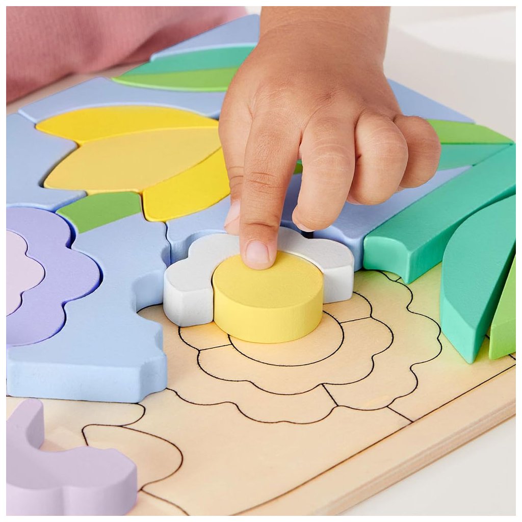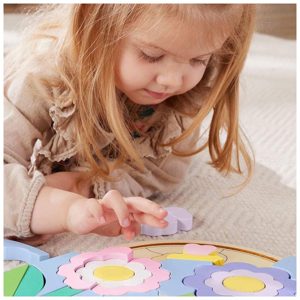 Sada je dodávána s dřevěnou podložkou, která usnadňuje uspořádání jednotlivých dílků na správná místa. Všechny dílky v sadě jsou vyvedeny v barvách spojených s jarem. Skvělé učení hrou! Rozvíjí koordinaci a motoriku dítěte!