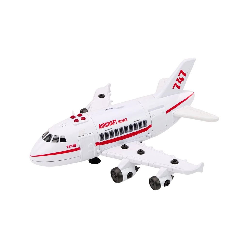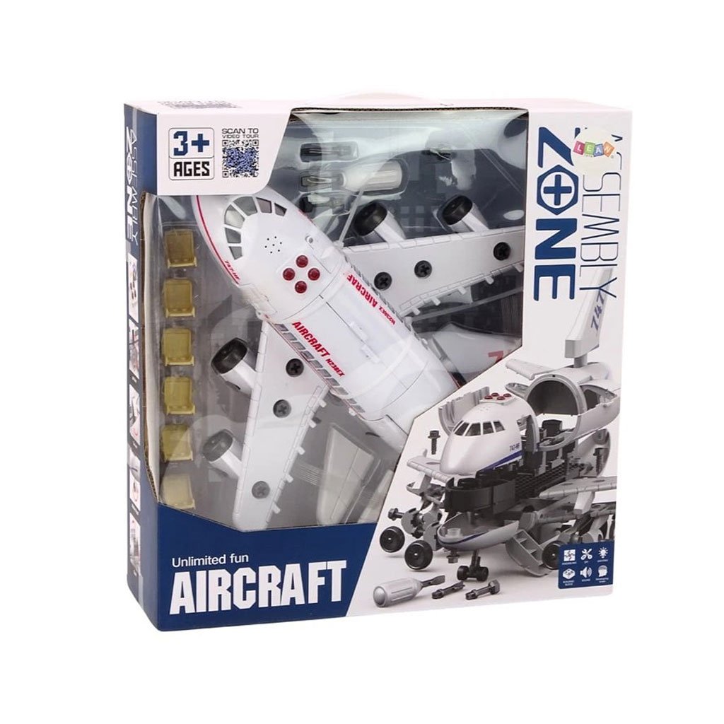 Letadlo se světlem a se zvukem. Za pomocí přiloženého dětského šroubováku lze letadlo rozložit a složit. Po stisknutí tlačítka na letadlo vydává zvuky. Ideální pro rozvoj kreativního myšlení. Velikost letadla je 45 centimetrů. Světlo a zvuk fungují po vložení 3 x 1.5V LR44 baterií, které jsou součástí balení.