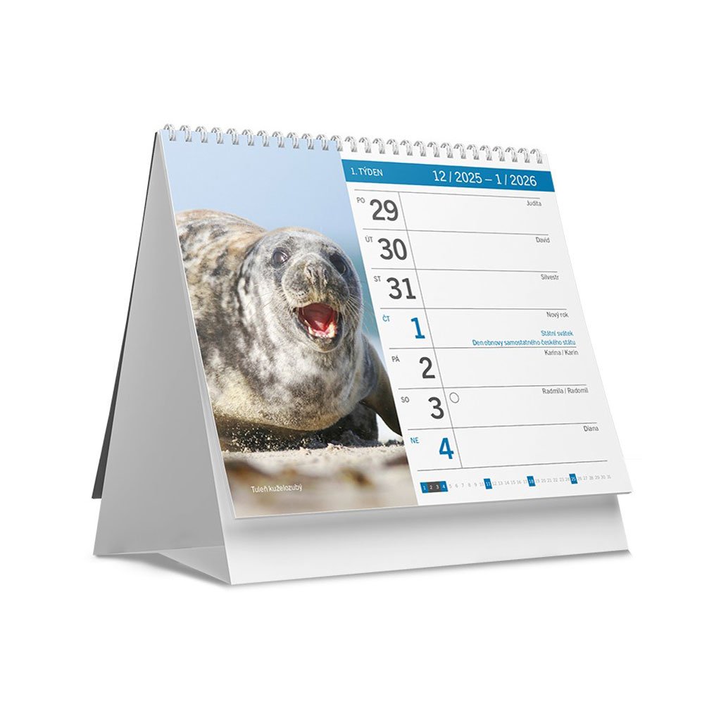 Přeneste si atmosféru zoologické zahrady na stůl se stolním kalendářem Zvířata v ZOO 2026. Obdivujte každý týden novou fotografii zvířete – od majestátního páva s roztaženými pery po roztomilého tuleně kuželozubého. Přehledné týdenní kalendárium obsahuje česká jména, státní svátky a prostor pro vaše denní záznamy. Nechybí ani miniaturní měsíční přehledy. Kroužková vazba zaručuje pohodlné otáčení listů.