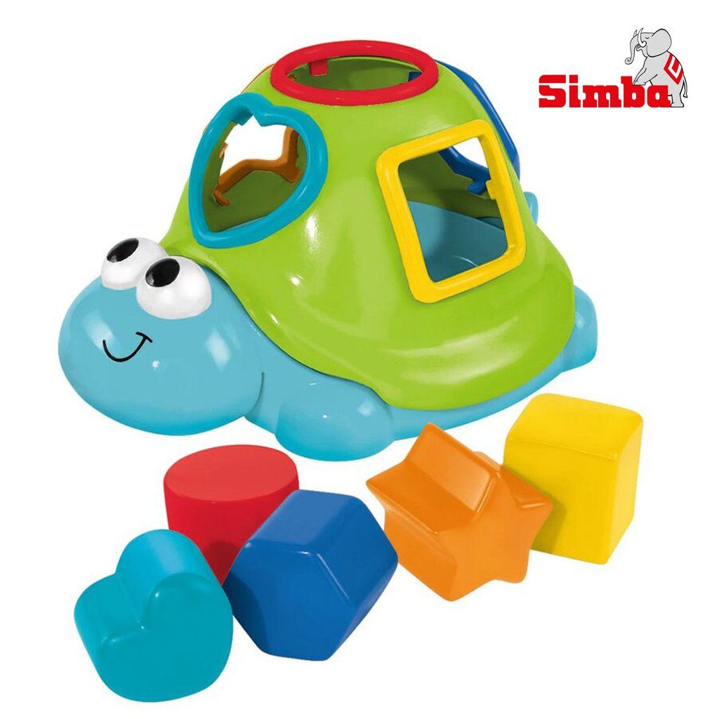Vkládačka ve tvaru želvy ve vodě plave na hladině, součástí 5 kostiček různých tvarů. Želvička je velká 20 centimetrů.