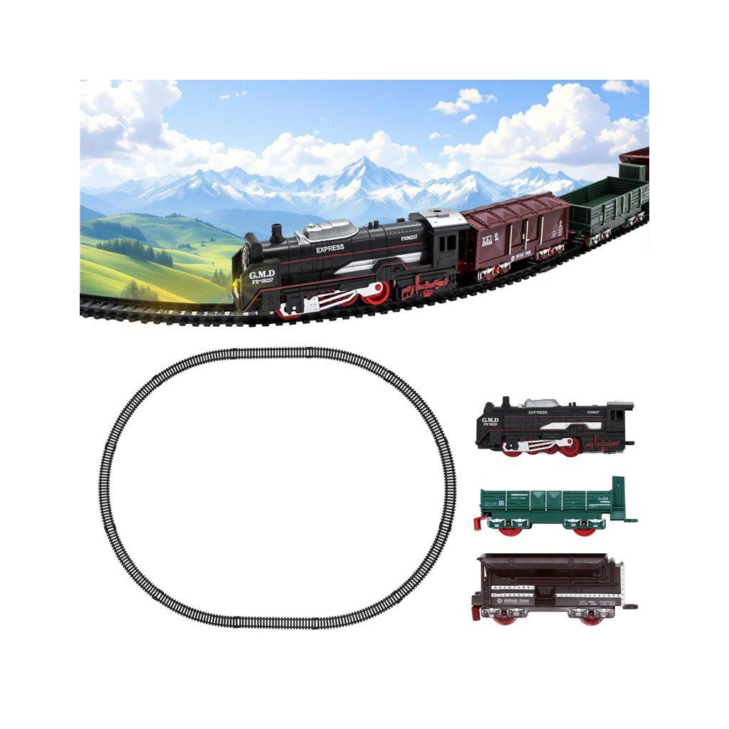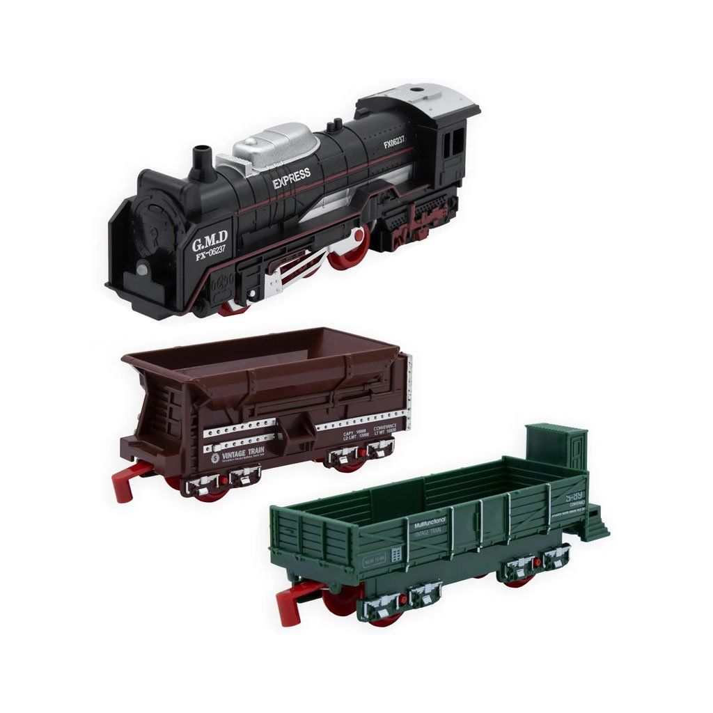 Sestavte si svou vlastní železnici! Plastový set obsahuje bateriemi poháněný model lokomotivy, nákladní vagóny a koleje. Užijte si velkolepou jízdu s vláčkem! V setu najdete lokomotivu a 2 vagóny.