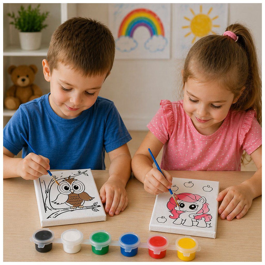 Podpořte dětskou fantazii a tvořivost s touto zábavnou malířskou sadou! Každý malý umělec si může vytvořit vlastní obrázek na předtištěném plátně s roztomilým motivem zvířátka. Stačí jen vzít štětec, namočit do barvy a pustit se do malování.