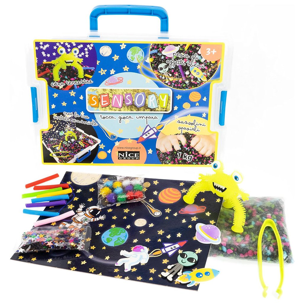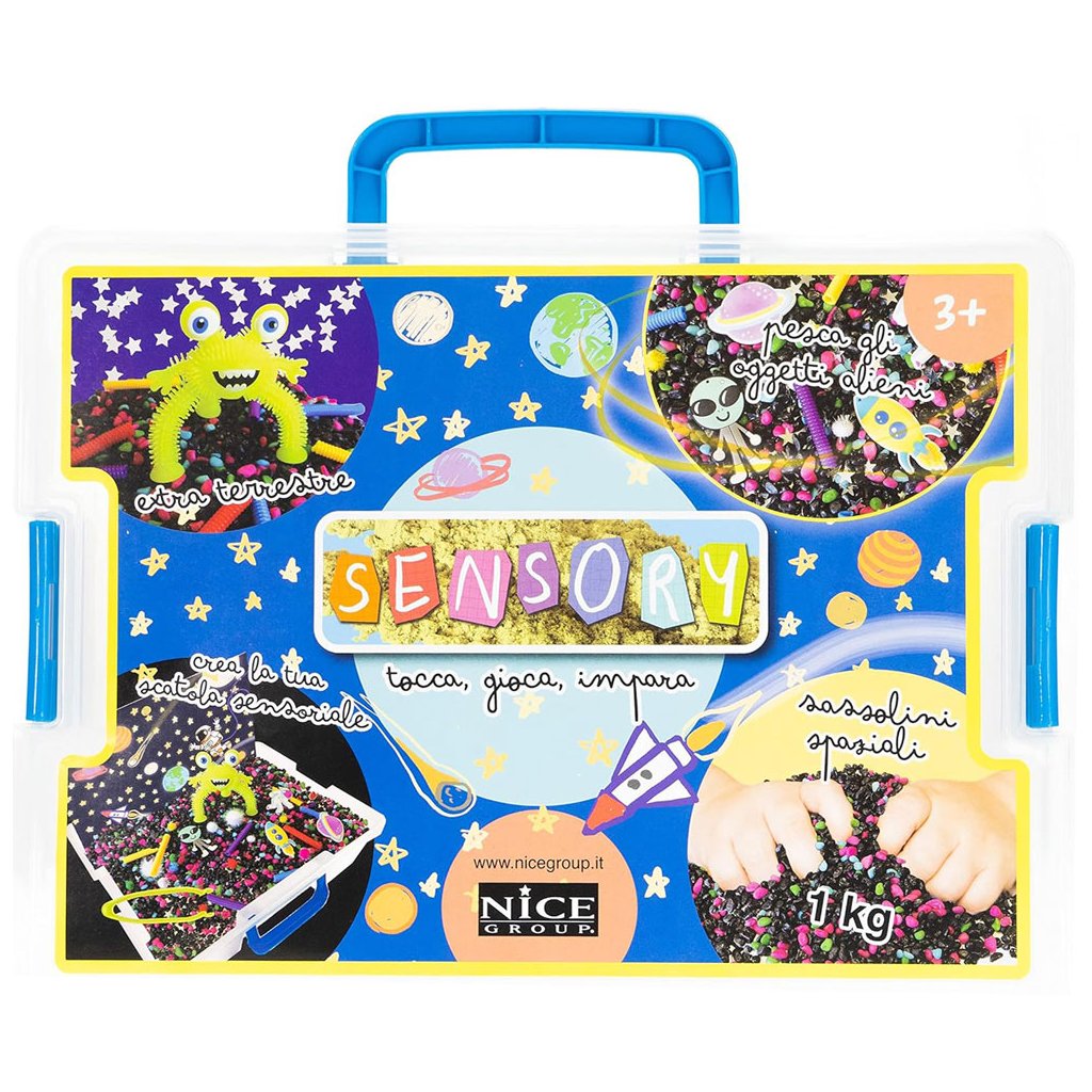 Kufřík plný kamínků a doplňků, aby stimuloval jemnou motoriku a představivost malých dětí. Manipulací s kamínky a používáním kleští k vylovení různých prvků tvarem, barvou a velikostí dítě dosáhne stavu klidu a soustředění.