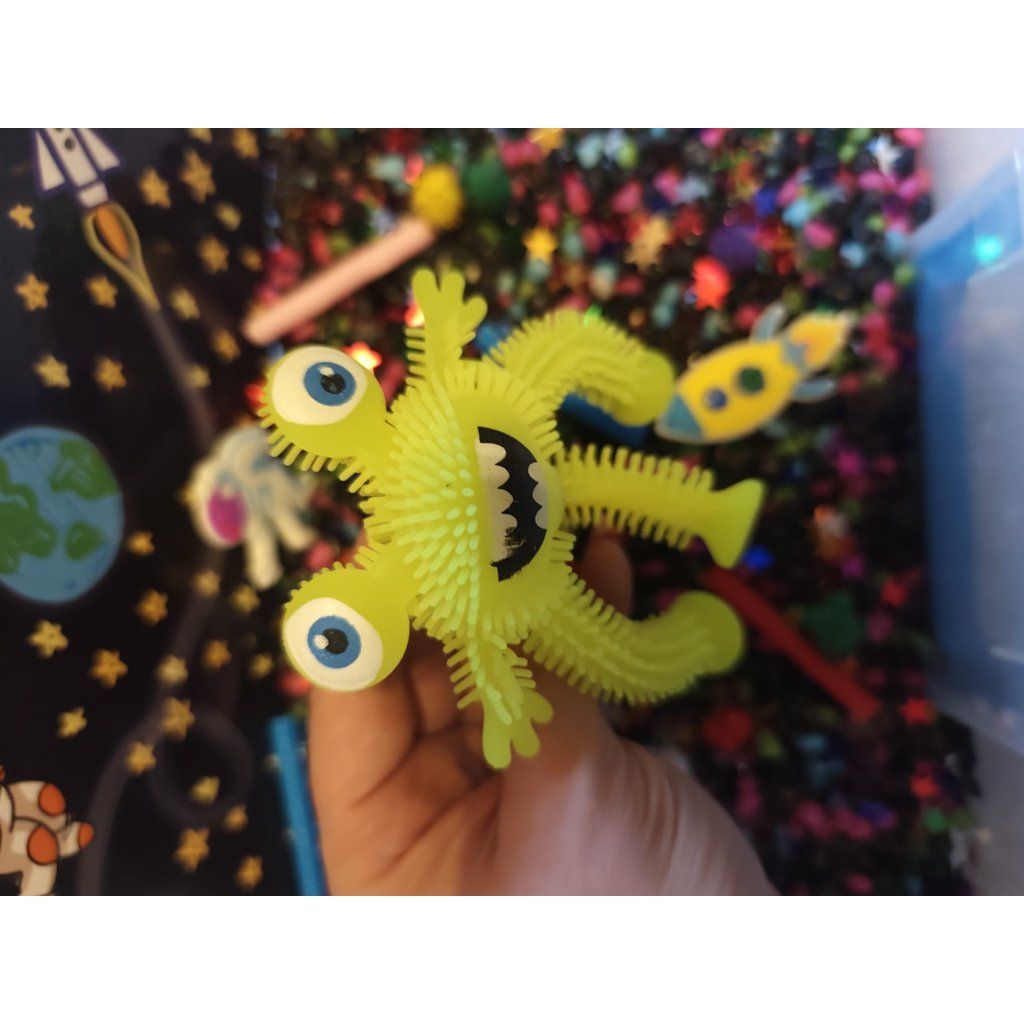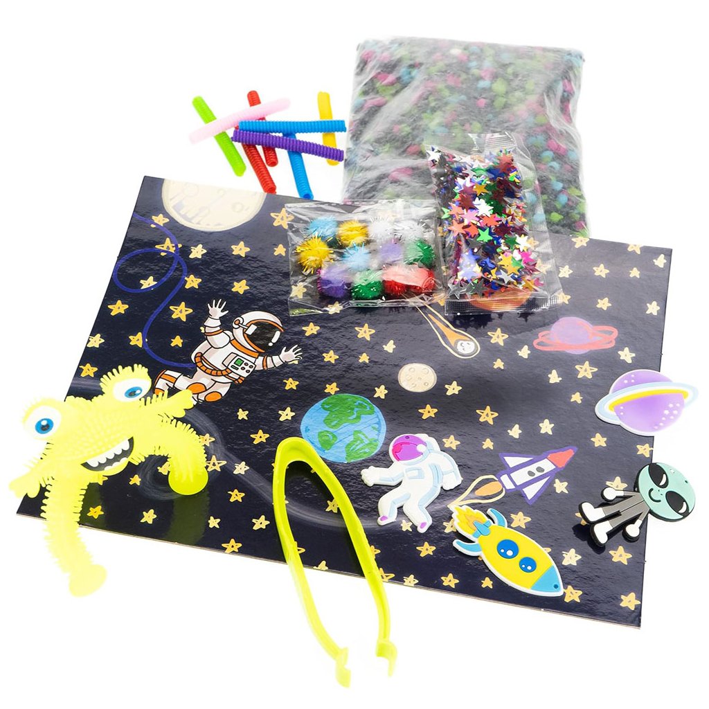 Obsah: 1 kg barevných kamínků, kleště, barevná peří, 4 silikonové figurky, gumový mimozemšťan, chlupaté bambulky, hvězdičky a vesmírné pozadí.