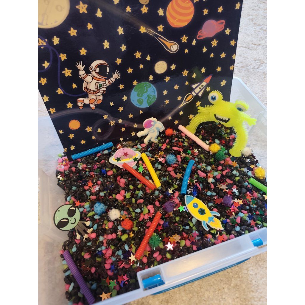 Použijte pouzdro jako pracovní plochu: nasypte barevné kamínky, promíchejte je a poslouchejte zvuk, který vydávají. Posypte hvězdičkami, chlupaté bambulky a měkkými silikonovými figurkami. Barevná peří a rybičky vytahujte kleštěmi. Nechte gumového mimozemšťana bloudit po vesmírných kamenech v rovnováze a s fantazií se vydejte na mezigalaktickou cestuů.