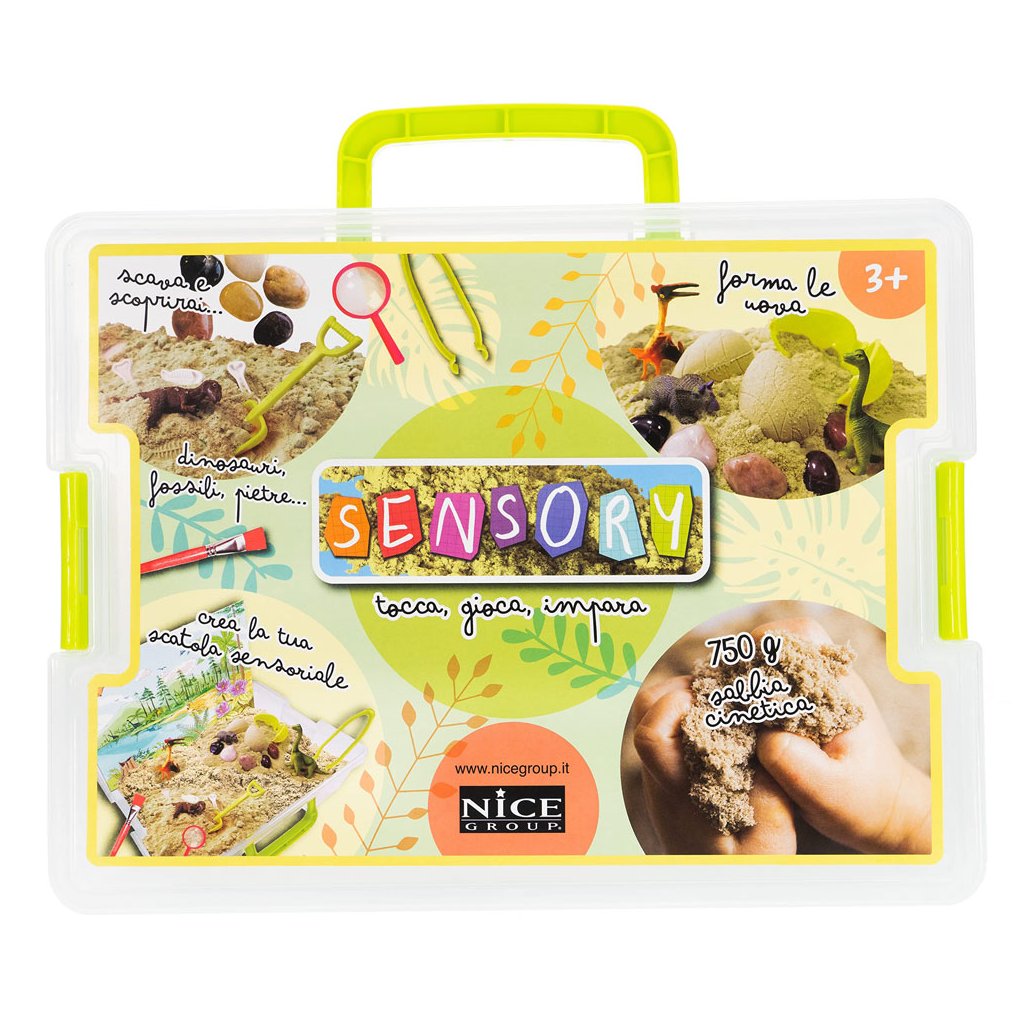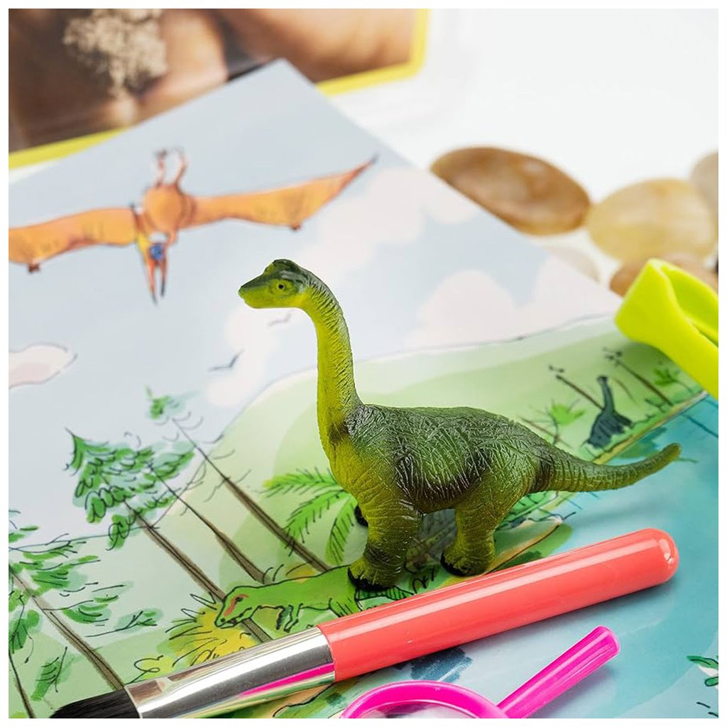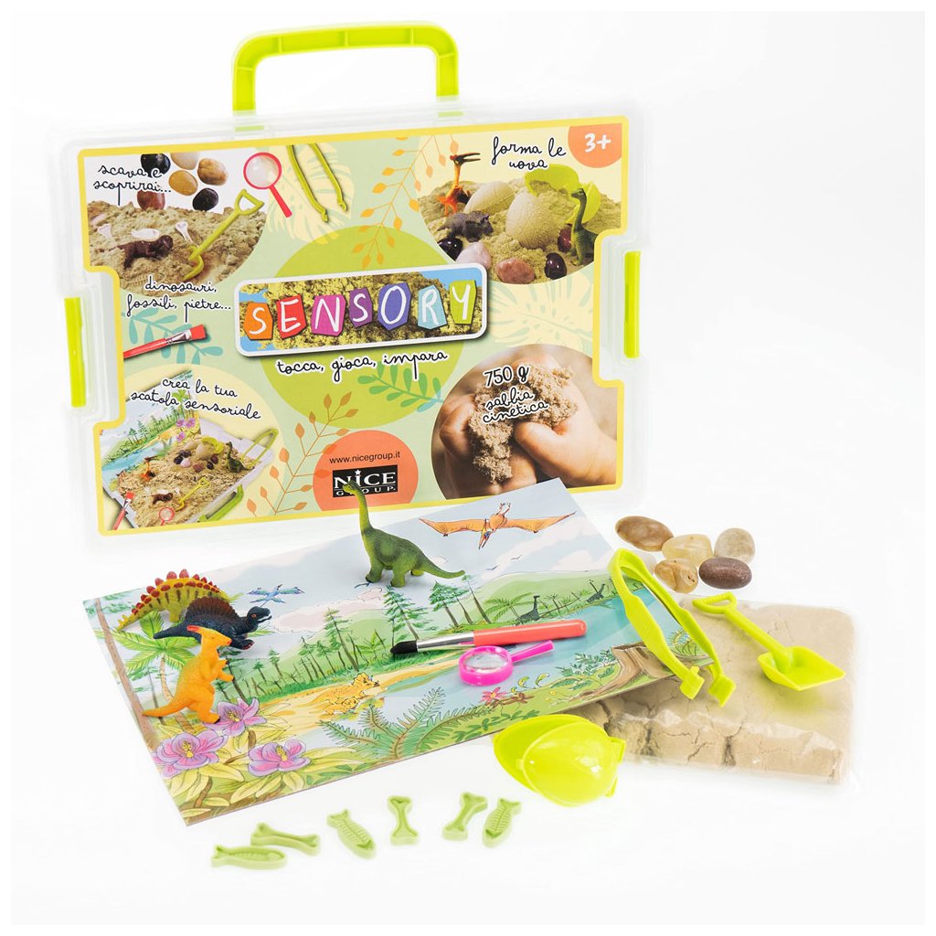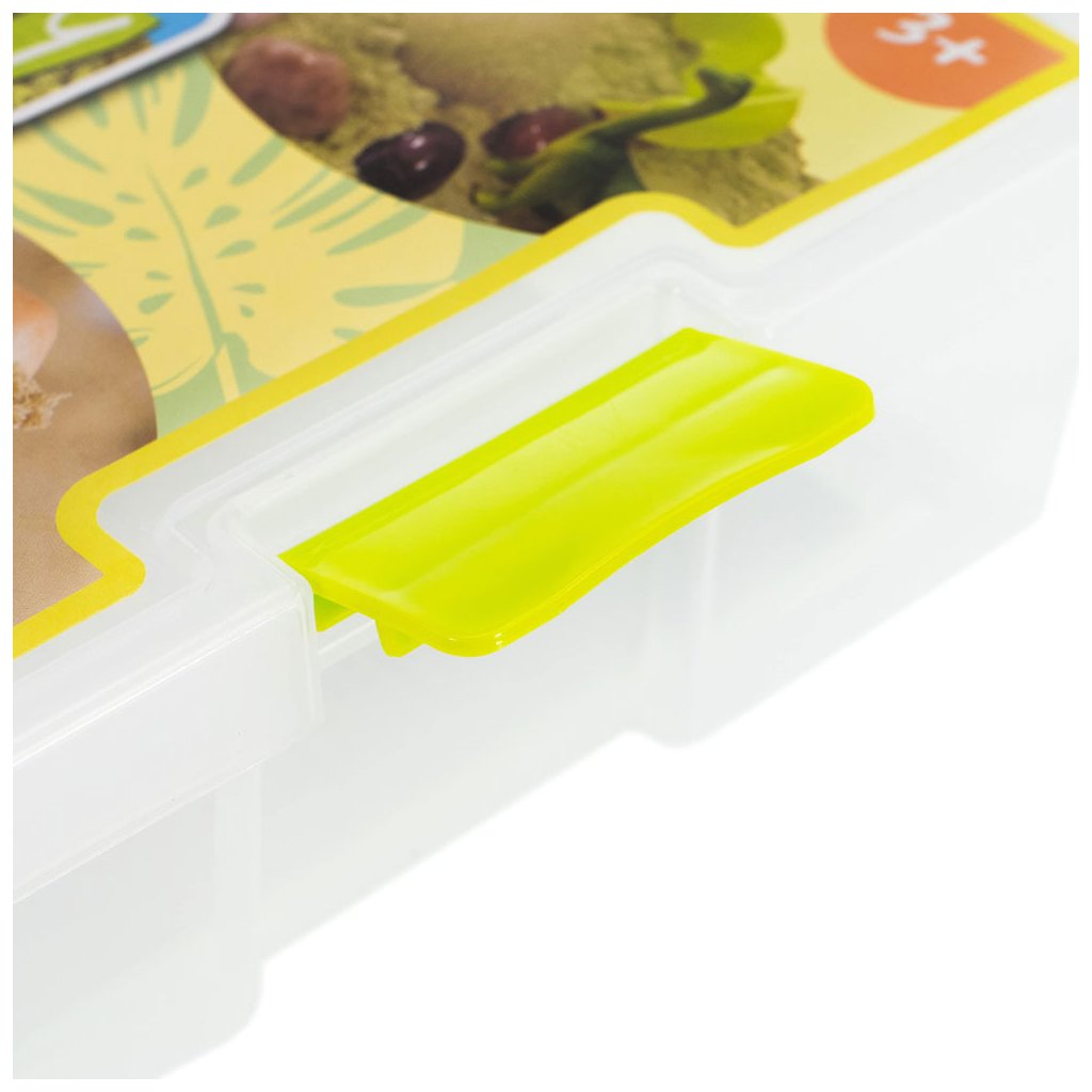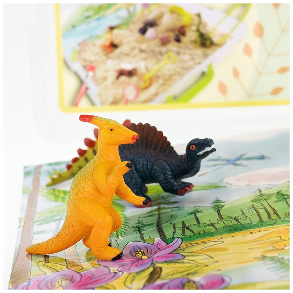 Sada obsahuje 750 gramů kinetického písku a dinosauří doplňky. Najdete tu dinosauří vejce, figurky a další doplňky a nástroje pro dinosauří vykopávky.