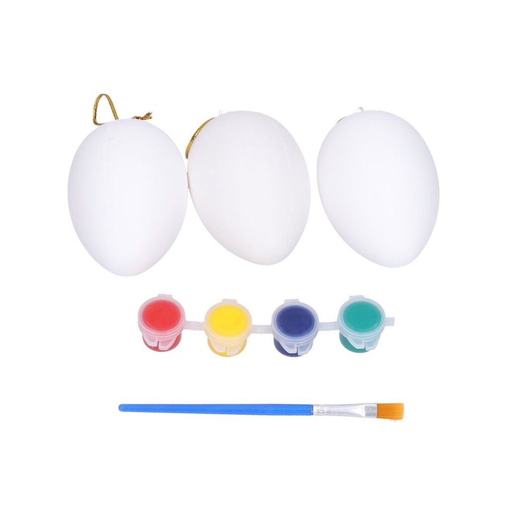 Vajíčka plastové na vybarvení o velikosti 5x8 cm 3 ks. Součástí balení barvy + štětec.